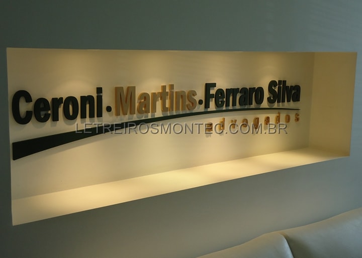 Letreiro para escritório de advocacia produzido em acrílico de 10mm de espessura recortado a laser com pintura nas cores dourada e verde conforme o padrão do logotipo da advocacia Ceroni Martins Ferraro Silva advogados com escritório localizado em Campinas - São Paulo - SP. Instalamos no escritório da advocacia o letreiro de acrílico em ambiente interno com requinte e sofisticação. Conheça também a nossa linha completa de letreiros que disponibilizamos e solicite o seu orçamento conosco.